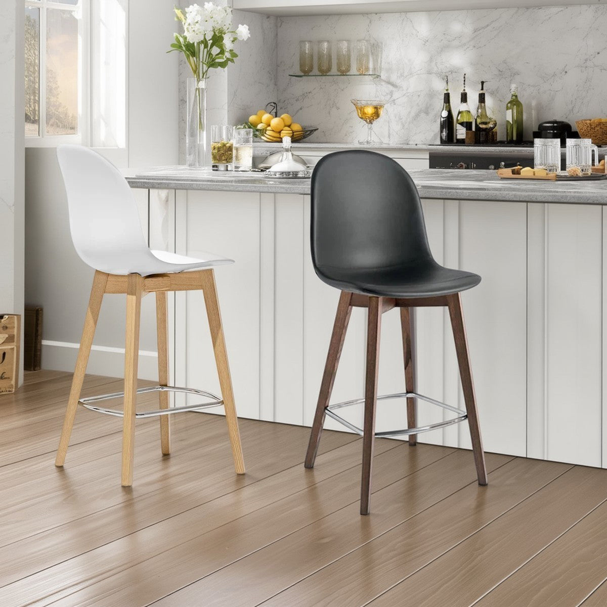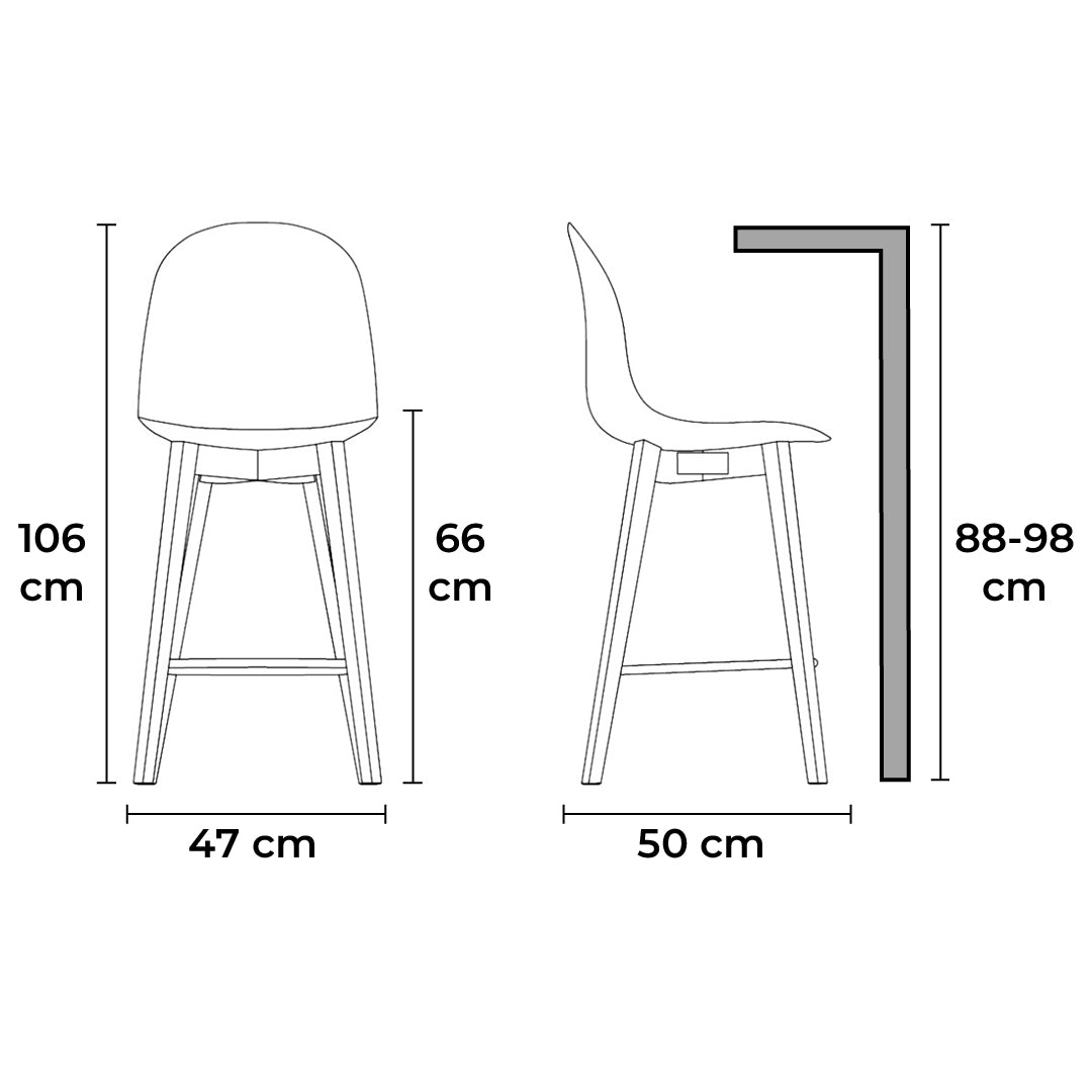 El banco Academy de ofrece la altura ideal para barras de cocina de entre 88 y 98 cm. Con una altura total de 106 cm y una altura de asiento de 66 cm, proporciona un equilibrio perfecto entre ergonomía y diseño. Su base de madera aporta estabilidad, mientras que su estructura compacta —47 cm de ancho por 50 cm de profundidad— lo convierte en una opción funcional incluso en espacios reducidos. Cada dimensión está pensada para brindar comodidad sin renunciar al estilo.