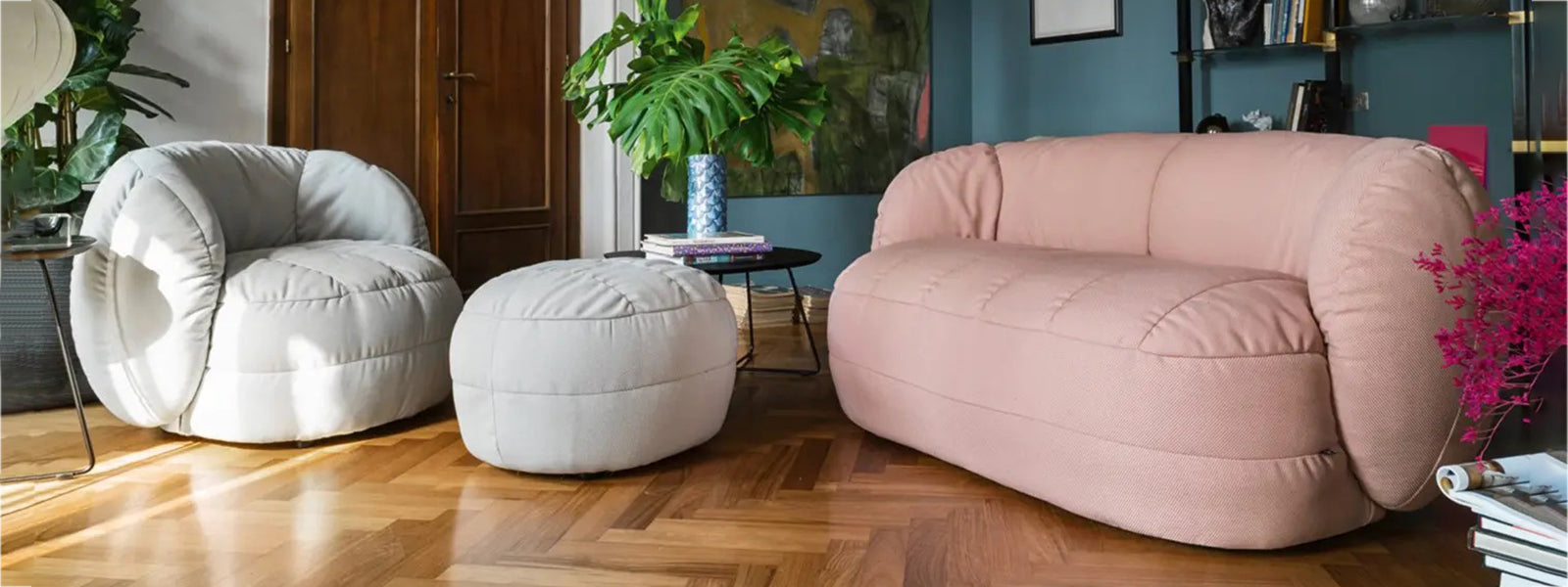 Butacas, poufs y mesas para sala con diseño eco-consciente