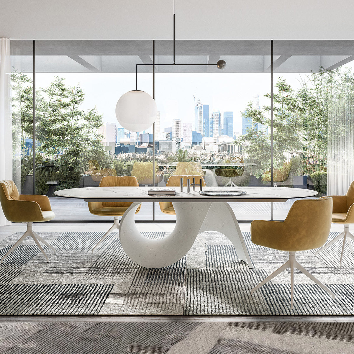 CS4141-FB 250 El reto de diseño de la mesa SEASHELL consiste en el uso de un nuevo material para la base: el cemento. Este material, a menudo asociado con la idea de «pesadez y solidez», tanto física como visual, se ha replanteado de forma que resulte ligero, pero al mismo tiempo resistente. La decisión de utilizar formas suaves y sinuosas se inspira en las formas orgánicas presentes en la naturaleza y, en especial, en la de la concha marina, que, gracias a sus superficies caracterizadas por curvas y nervaduras, genera una gran solidez estructural a pesar del material increíblemente frágil del que está compuesta. De esta manera, el cemento utiliza un nuevo lenguaje formal y funcional, la base central ofrece la máxima usabilidad y, en función del punto desde el que se mire, se transforma y genera otras formas. Una combinación de inspiración y funcionalidad, de ligereza y resistencia, una mesa de gran expresividad, un objeto de uso cotidiano transformado en una figura esencial y escultórica que exhibir.