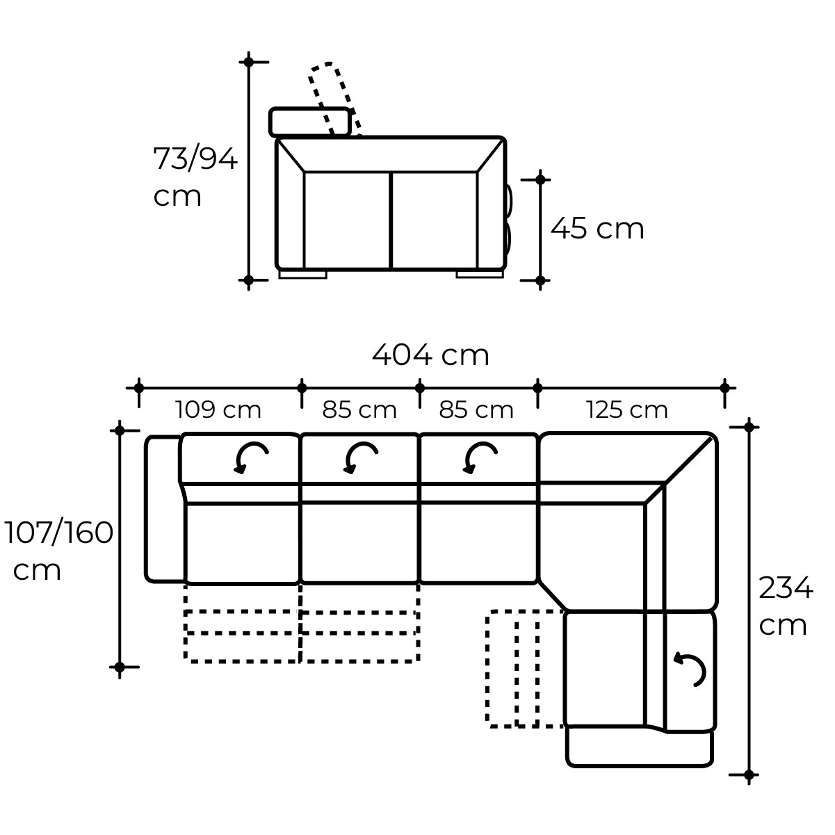 MEDIDAS Altura 75/96 cm Altura del asiento 45 cm Ancho 319 cm Profundidad 319 cm Profundidad Reclinable 107/160 cm