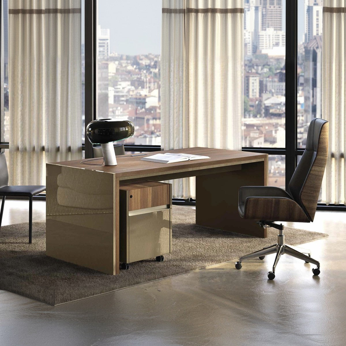 Para la colección Porta Romana Home Office, combinamos madera de nogal noble con detalles dorados de alto brillo para crear un espacio de trabajo que aúna elegancia y funcionalidad. Diseñado para la vida urbana, ofrece un ambiente refinado que favorece la concentración y la organización.