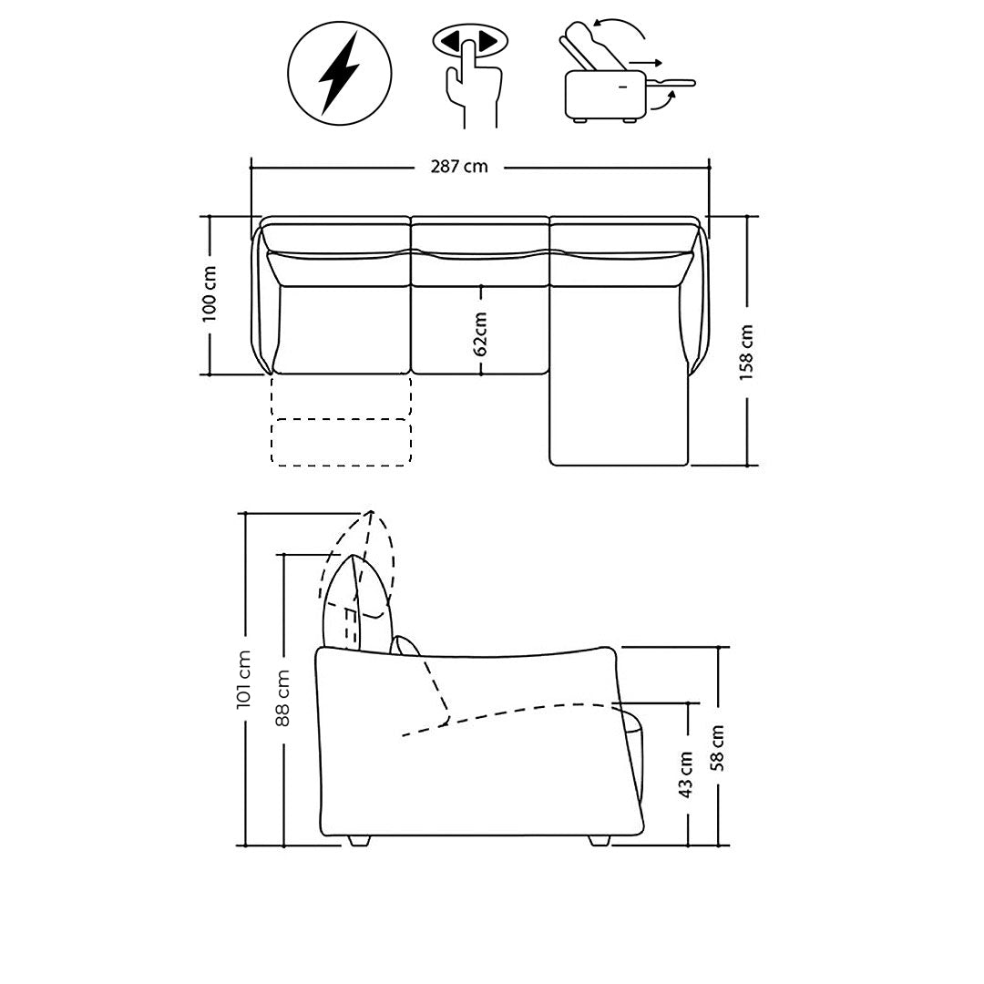 MEDIDAS Altura 88 – 101 cm Profundidad 62 / 158 cm Ancho 287 cm